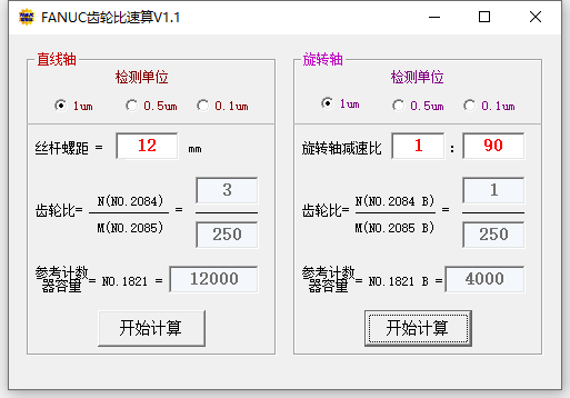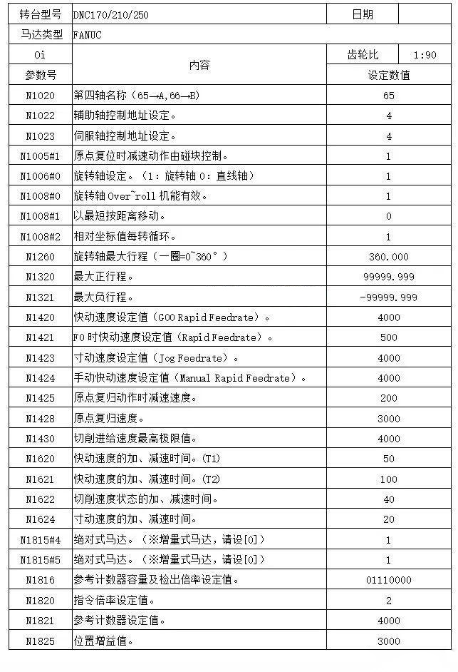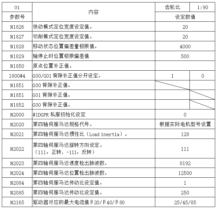 5.标准参数文档默认的参数值使用的条件为:第四轴均为旋转轴,电机与转台间的减速比为1:90 根据柔性齿轮比计算公式N/M=电机一转转台移动的距离(检测单位为:1um)/1000000,对于减速比为1:90的轴,其柔性齿轮比为:NO.2084/NO.2085=360*1000÷90/1000000=1/250;参考计数器容量NO.1821=360*1000÷90=4000